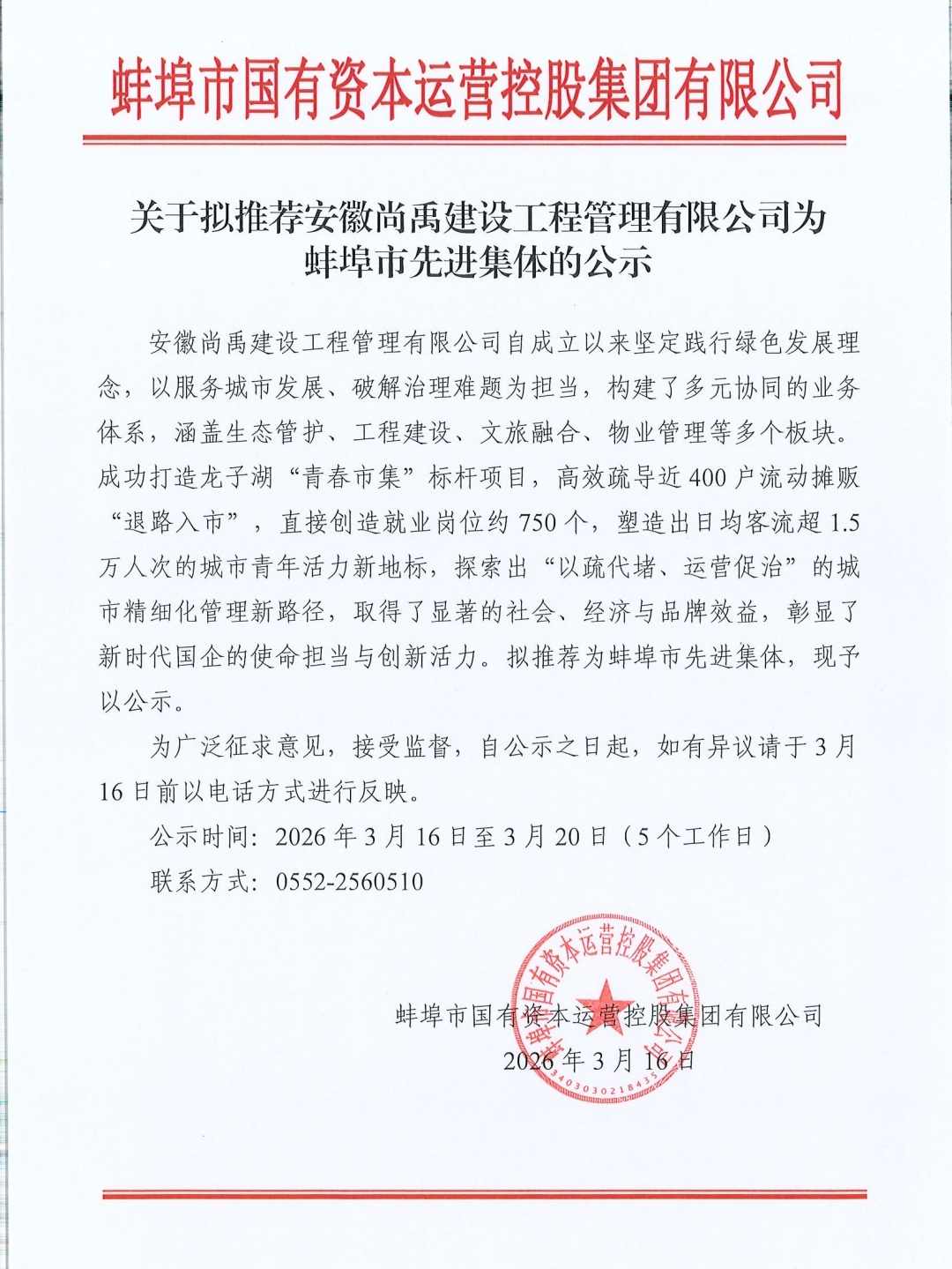 关于拟推荐安徽尚禹建设工程管理有限公司为蚌埠市先进集体的公示
