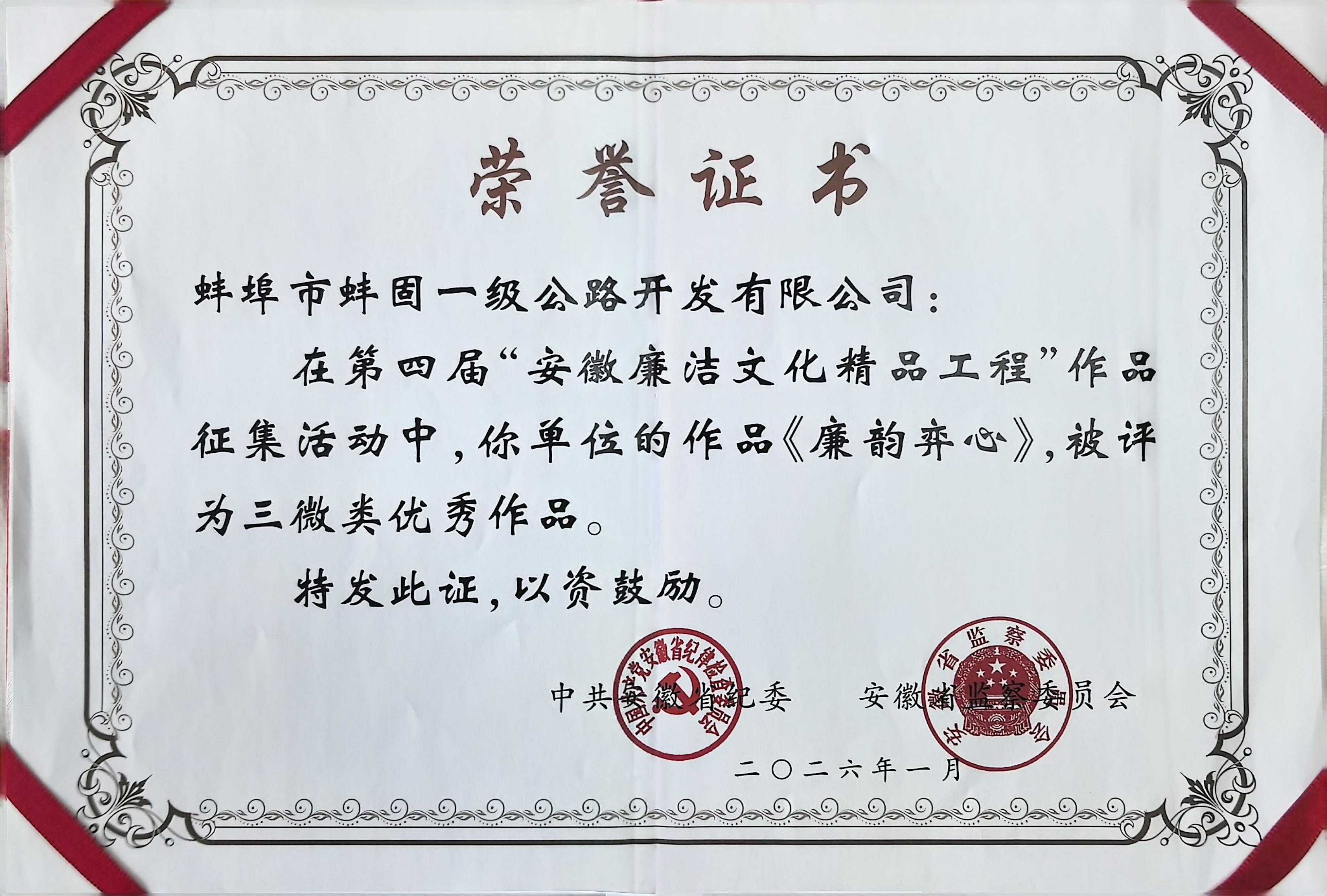 近日,中共安徽省纪委、安徽省监察委员会正式公布第四届安徽廉洁文化精品工程作品征集评选结果,由国控集团报送、交控集团选送、蚌固路公司创作的廉洁文化作品《廉韵弈心》,成功获评三微类优秀作品。该奖项是全省廉洁文化领域最高层级官方奖项,充分彰显了集团廉洁文化建设的突出成效。
